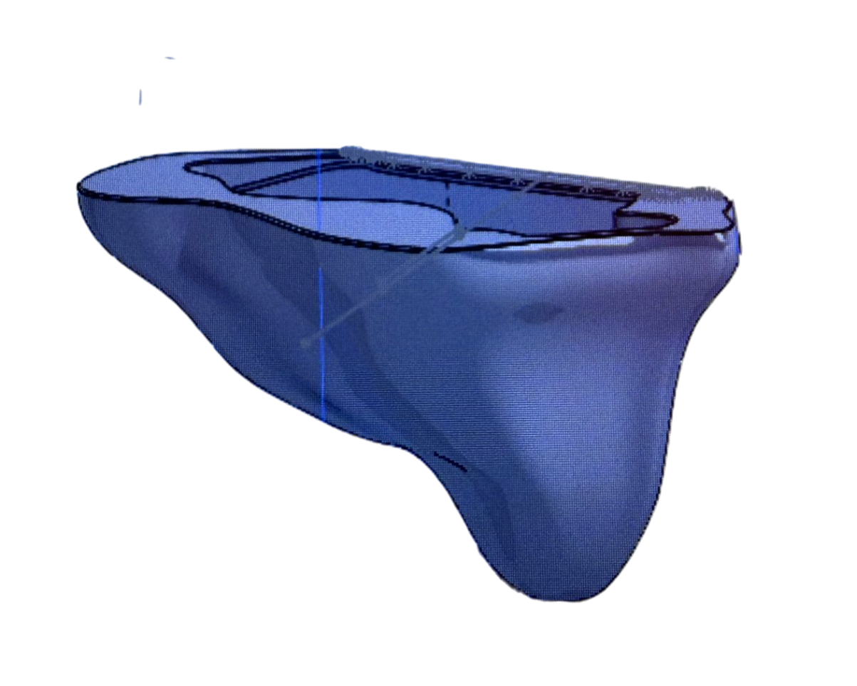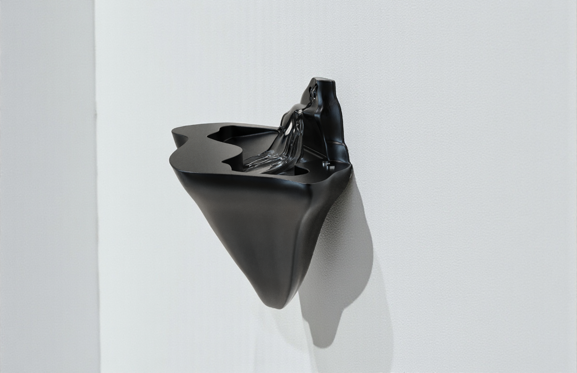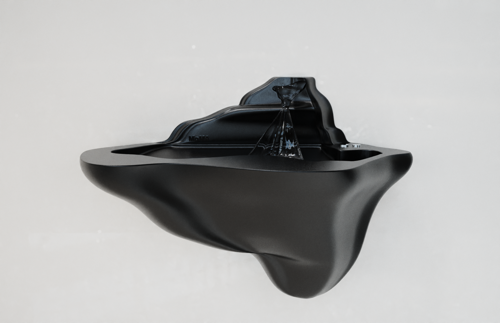 Modeled in SolidWorks, the faucet and sink were designed with a subtle forward tilt, directing water toward a concealed linear drain integrated into the front wall. This detail allows the water to visually disappear, reinforcing the illusion of uninterrupted flow. The form incorporates soft curves, wrinkles, and divots to evoke the irregular surface qualities of natural stone.