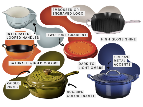 While Le Creuset frequently rotates colors, the brand’s core identity relies on a signature two-tone gradient that transitions from dark to light. To maintain brand authenticity, my concept utilizes these highly saturated, vibrant hues to match the existing products.